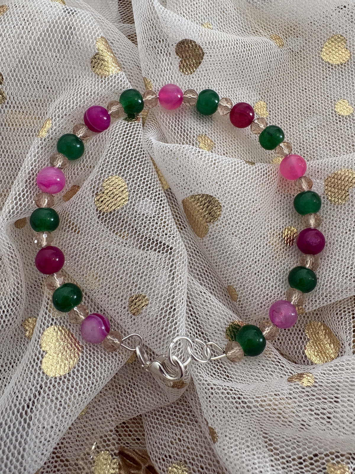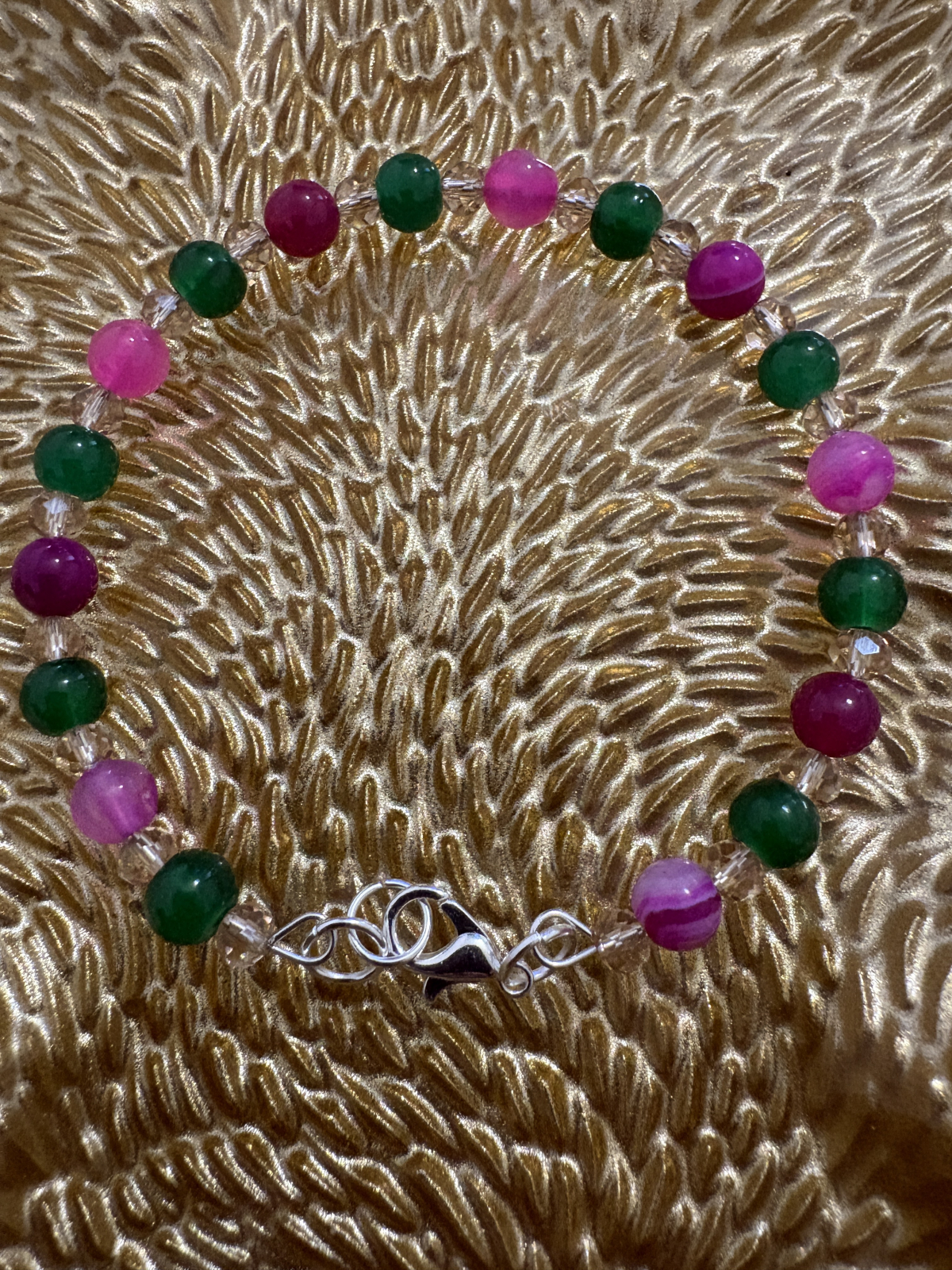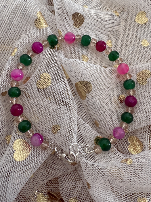 Brățară realizată din agat roz, jad verde și cristale transparente, montată pe fir rezistent cu închizătoare metalică.