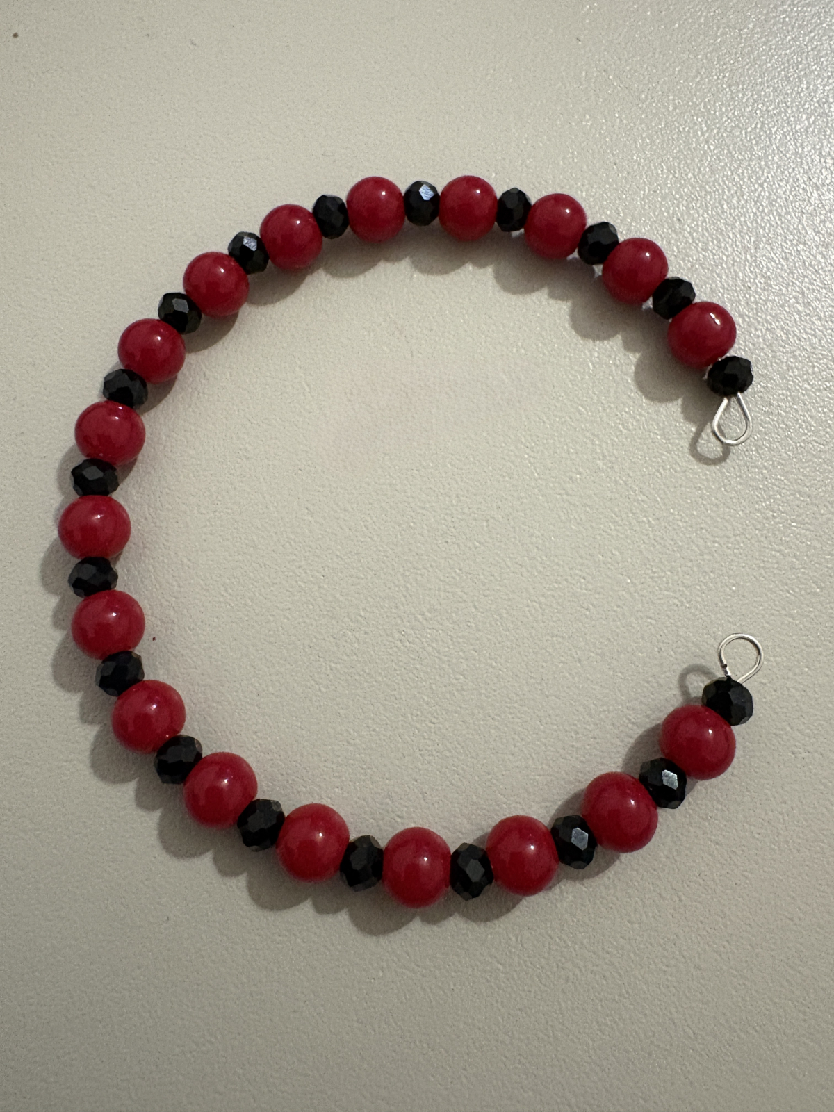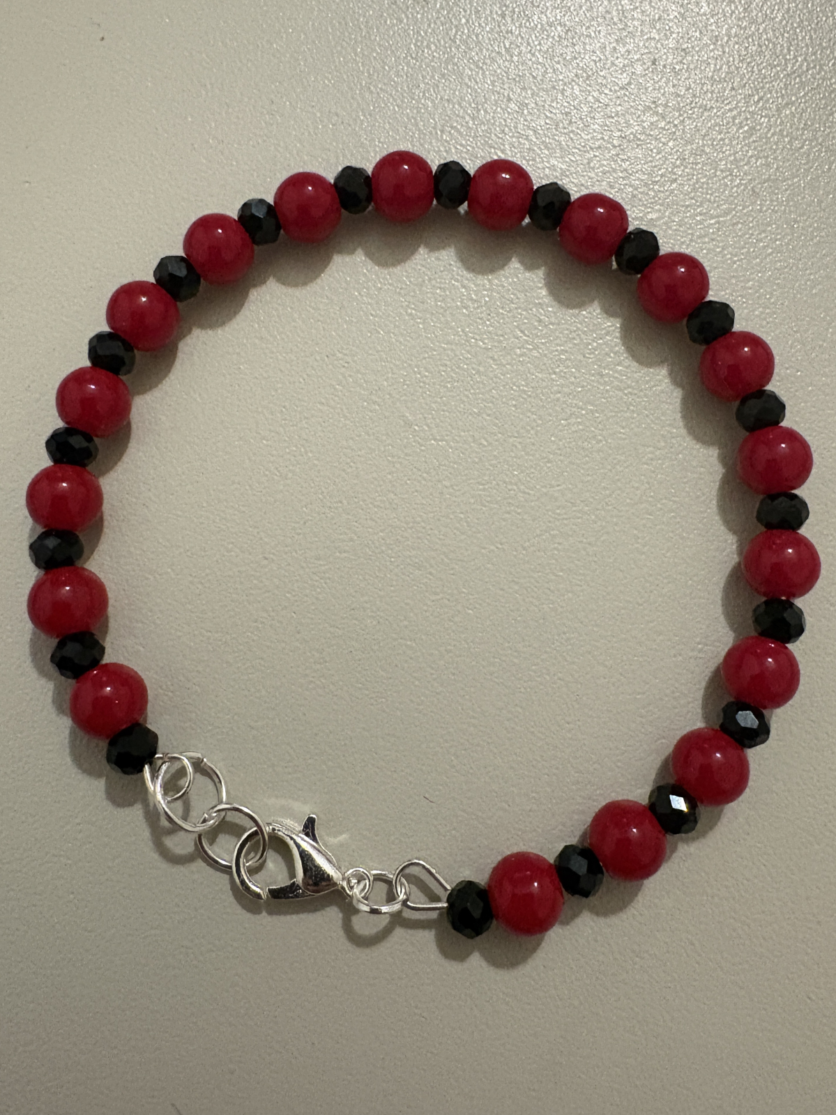 Brățară mărțișor handmade realizată din coral roșu de 6mm și cristale negre fațetate, creată pentru protecție energetică, vitalitate și echilibru.