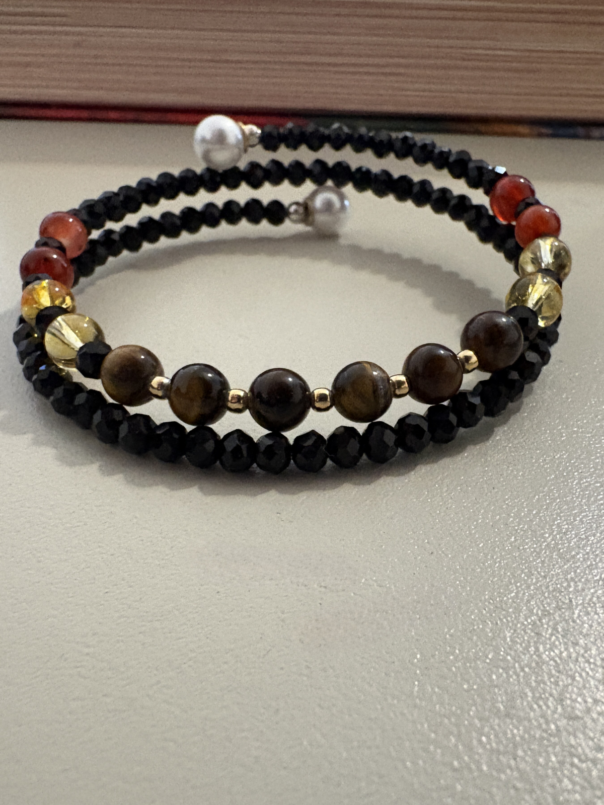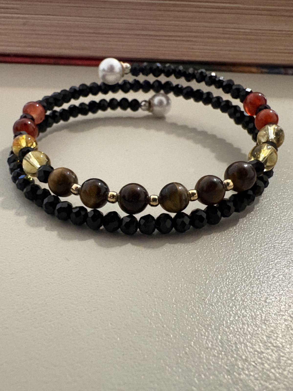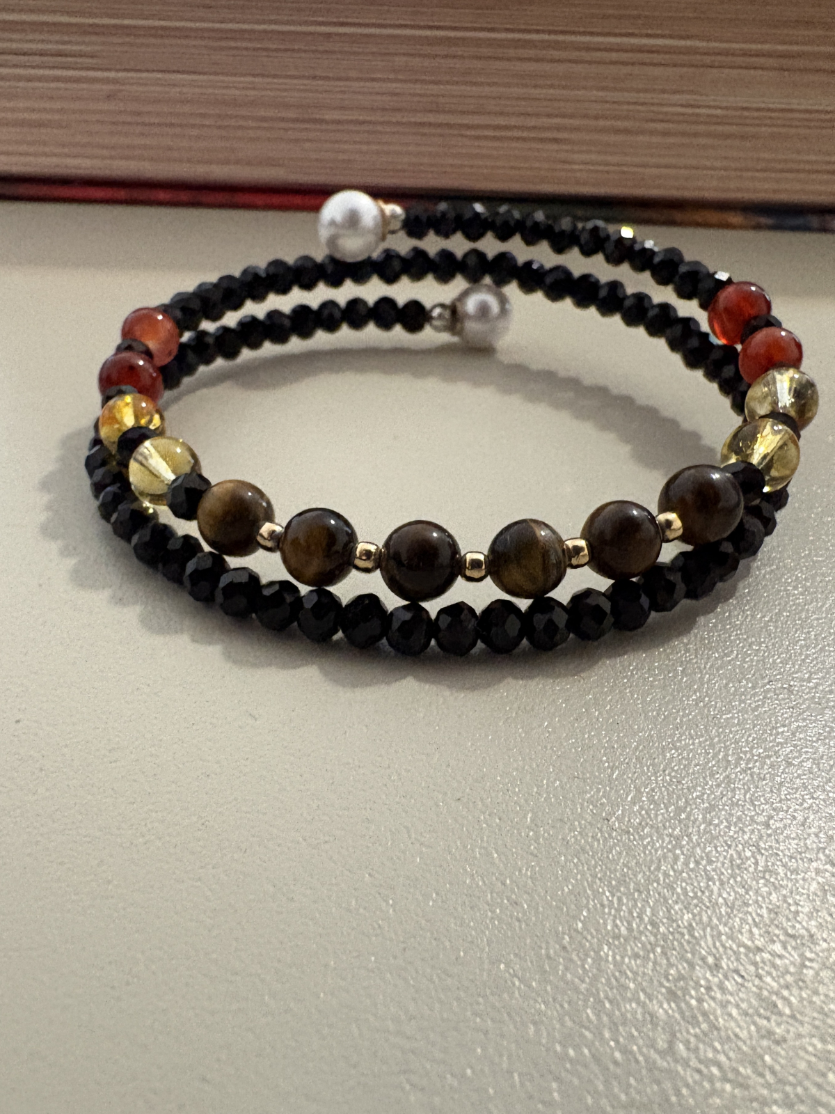 Brățară dublă handmade fără închidere, realizată din citrin, ochi de tigru și carneol, completate de cristale negre strălucitoare și bile din argint 925 placat cu aur, pentru un plus de eleganță și rafinament.