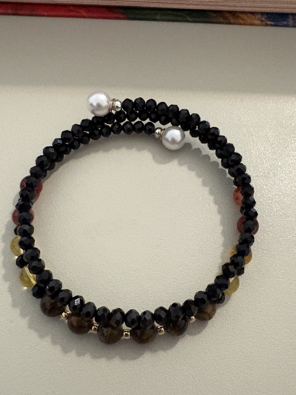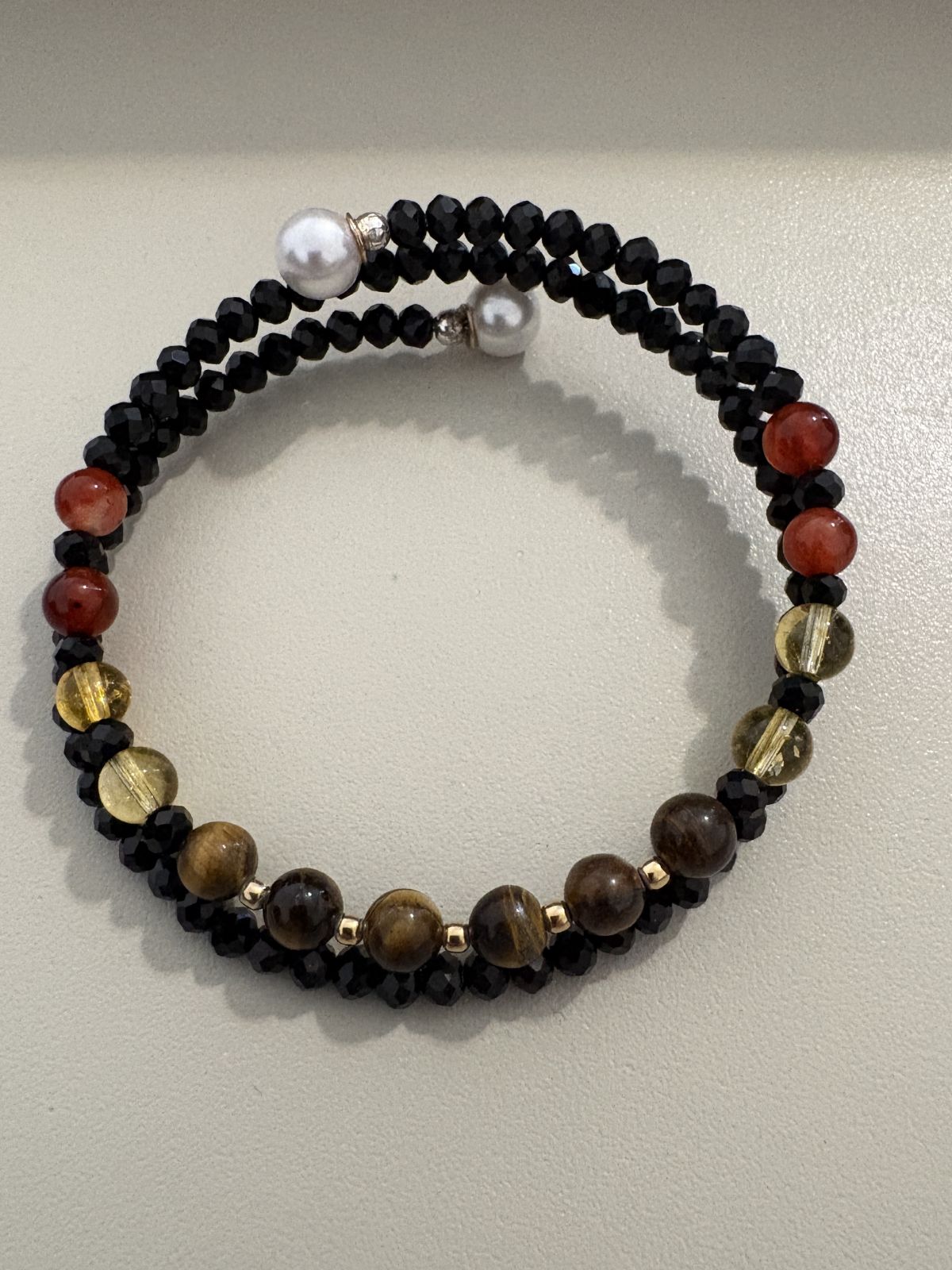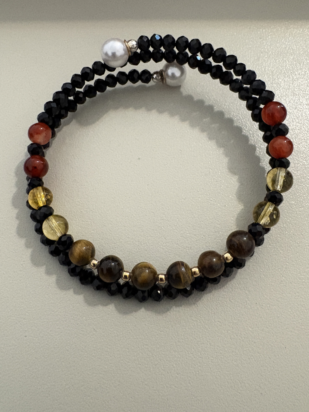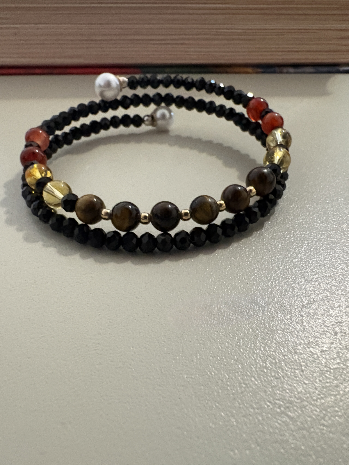 Brățară dublă handmade fără închidere, realizată din citrin, ochi de tigru și carneol, completate de cristale negre strălucitoare și bile din argint 925 placat cu aur, pentru un plus de eleganță și rafinament.