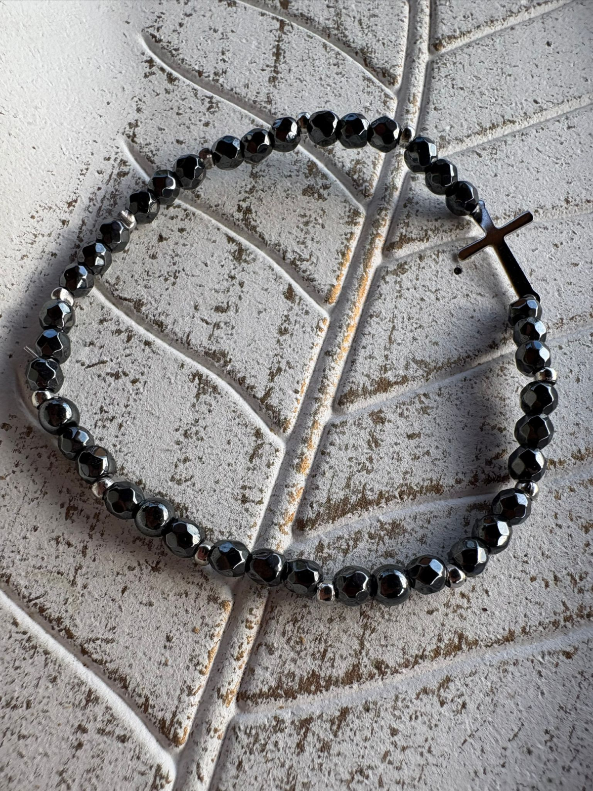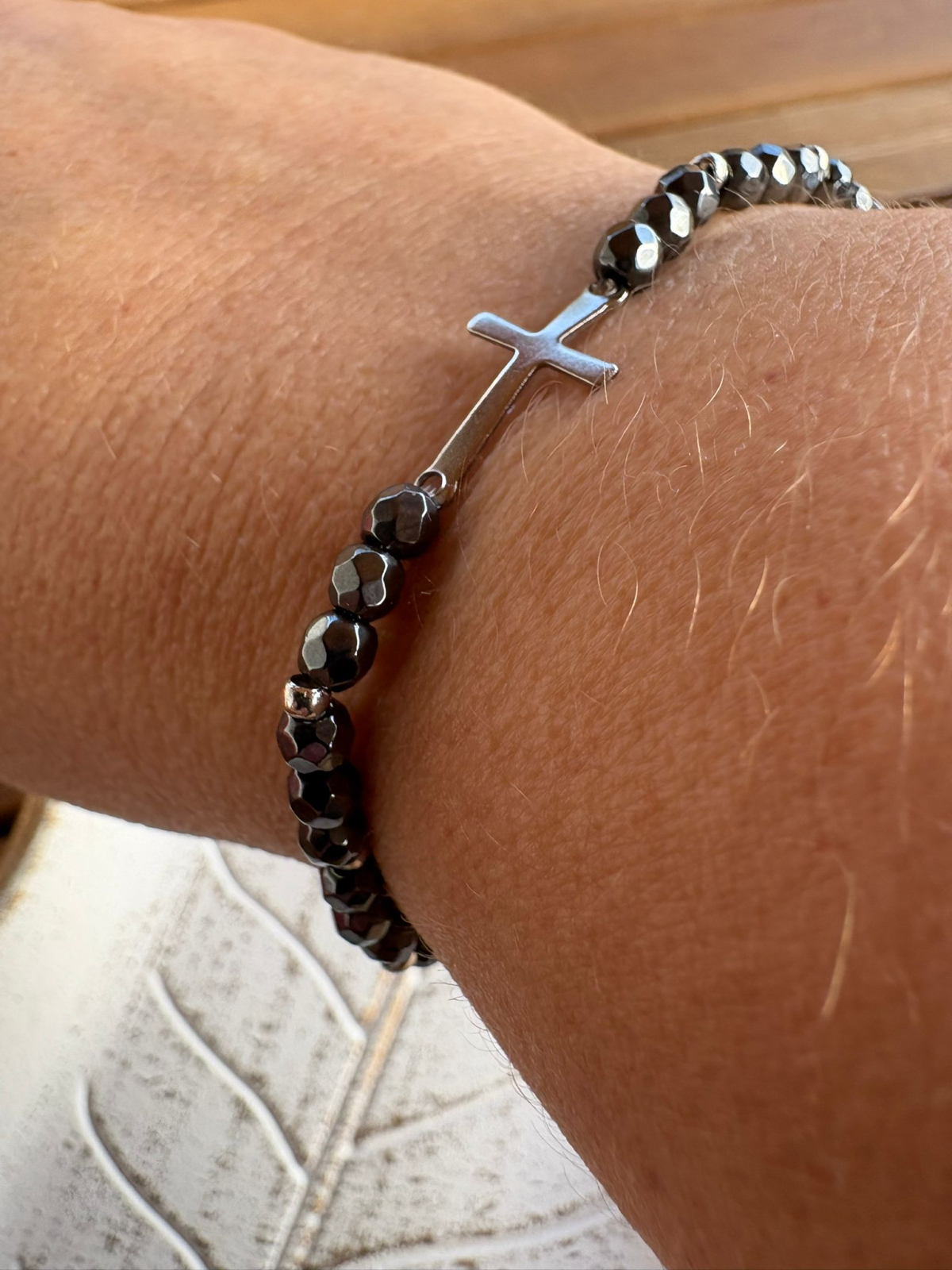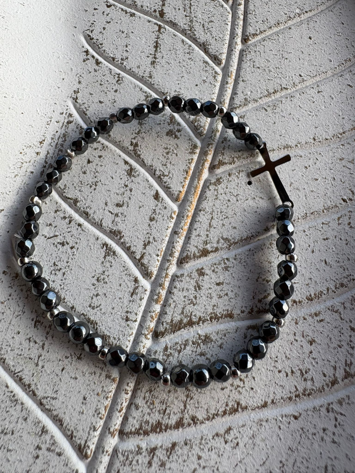 Brățară Hematit Fațetat cu Argint & Cruciuliță – Protecție, Împământare, Eleganță
