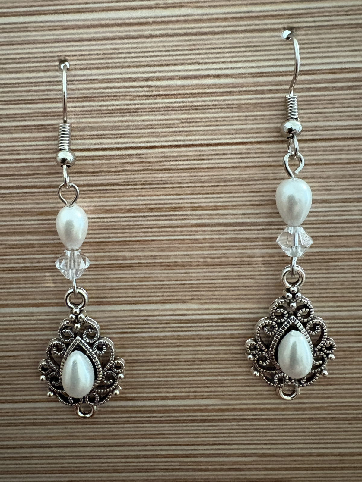 Cercei handmade cu perle de sticlă în formă de lacrimă, completați de cristale Preciosa biconice în nuanță light rose și elemente decorative boho cu aer vintage.