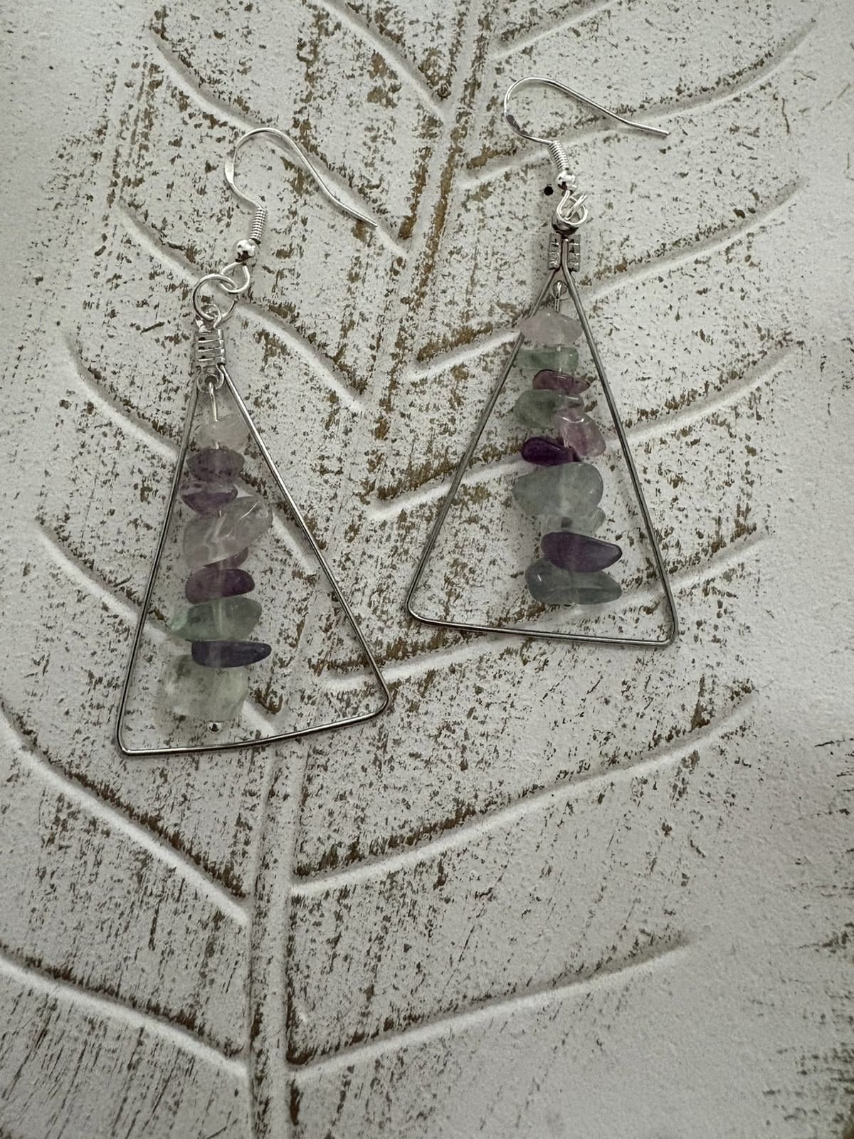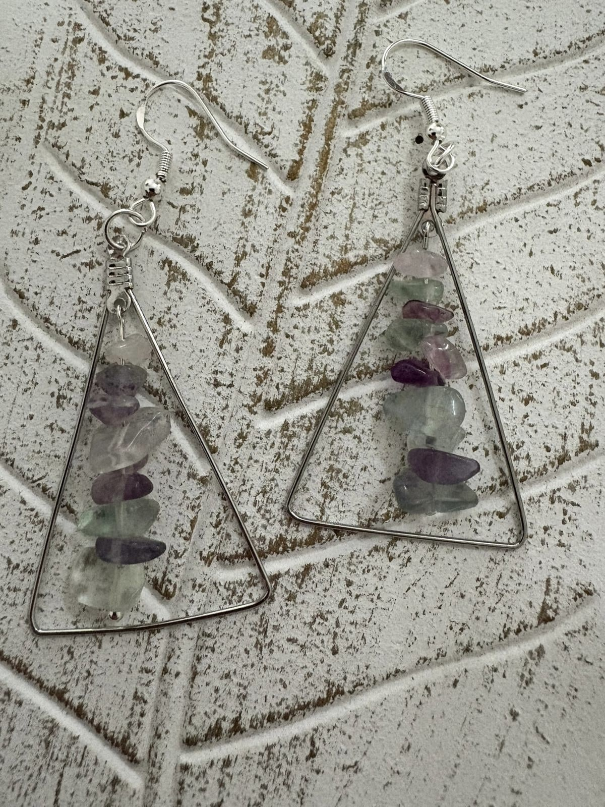 Cercei handmade cu fluorit natural, design geometric pentru claritate mentală și protecție energetică.