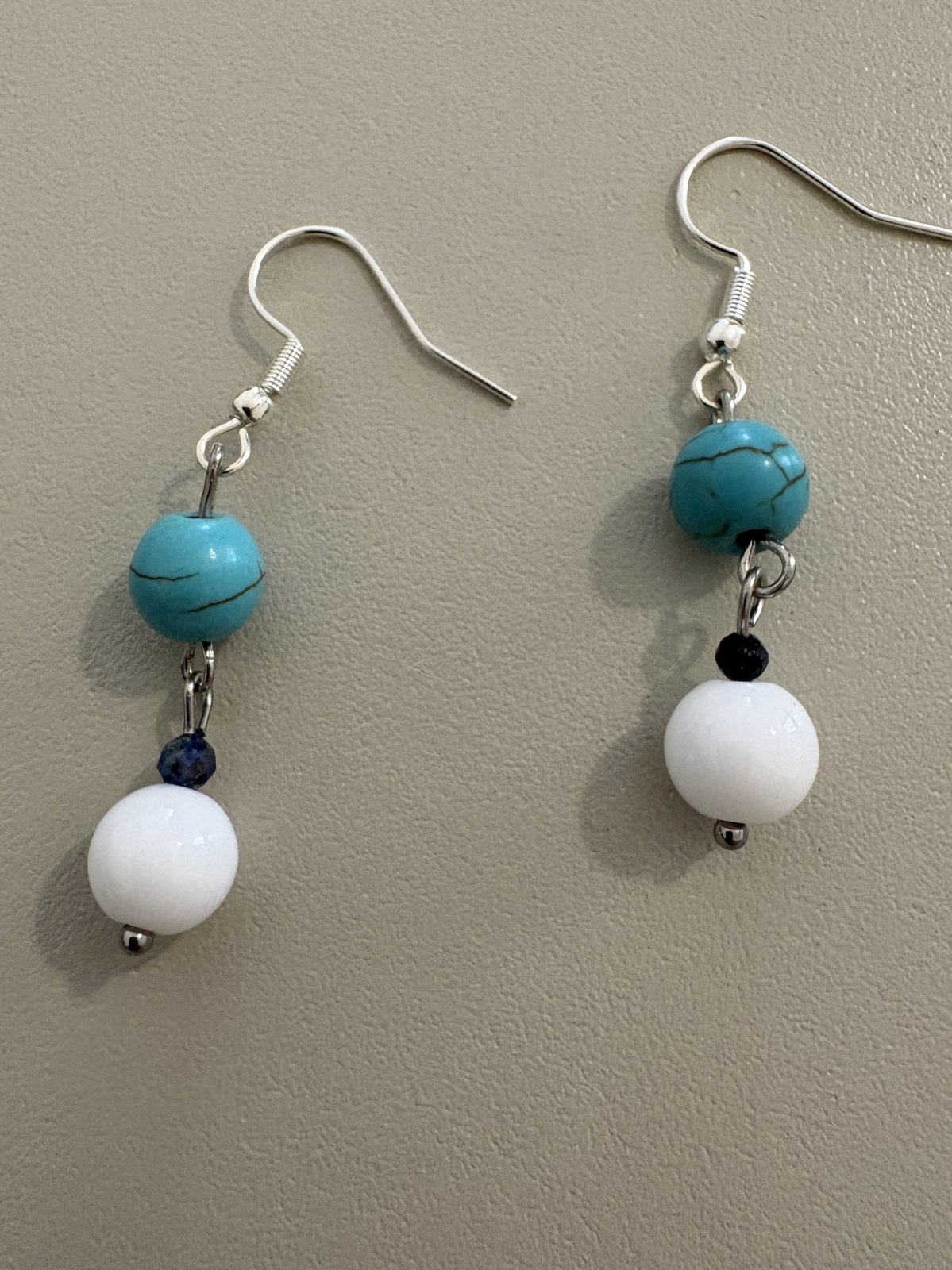 Cercei handmade realizați din onix alb, lapis lazuli și turcoaz, o combinație armonioasă de culori și energii care aduc echilibru, claritate mentală și protecție.