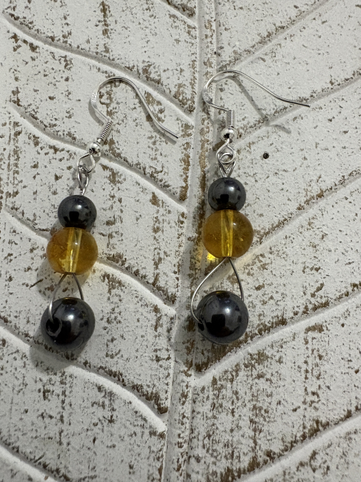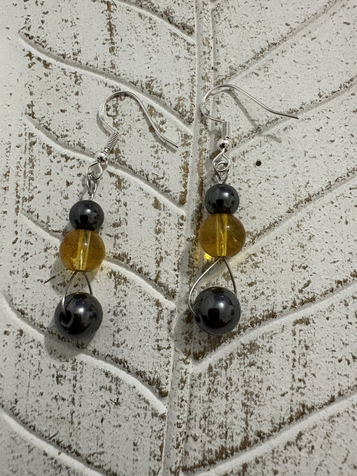 Cercei realizați din hematit și citrin, cu design delicat și elegant.
