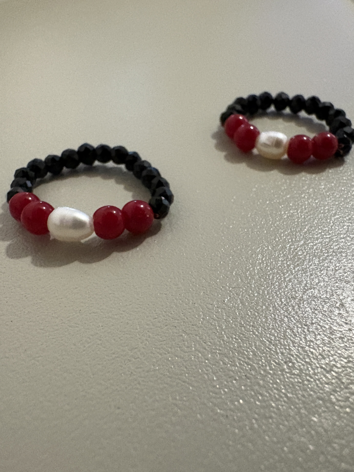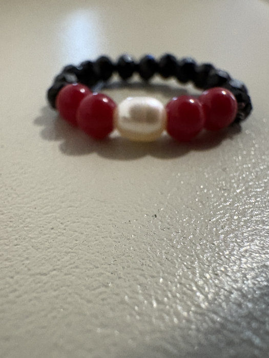 Inel mărțișor handmade, elastic și extrem de confortabil, realizat din perle naturale, coral roșu și cristale negre fațetate, într-un design echilibrat și elegant.