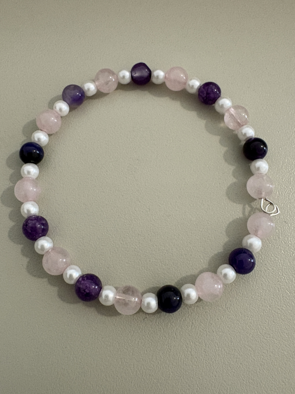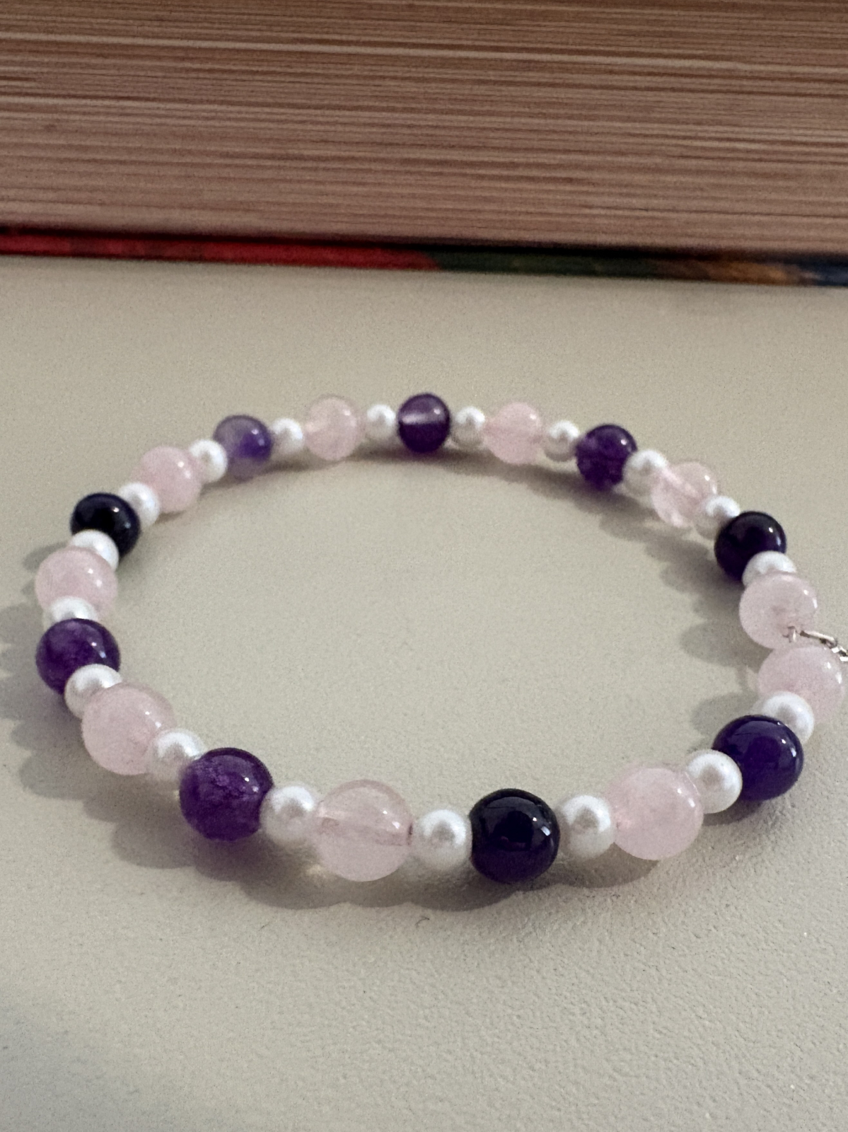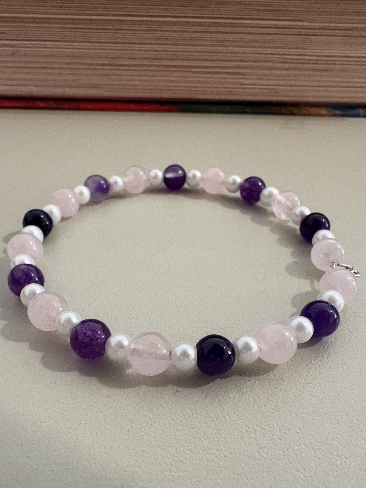Descoperă brățara "Cercei Magici" realizată din agat mov, cuart roz și perle de sticlă, un accesoriu delicat care îmbină armonia emoțională cu eleganța feminină.