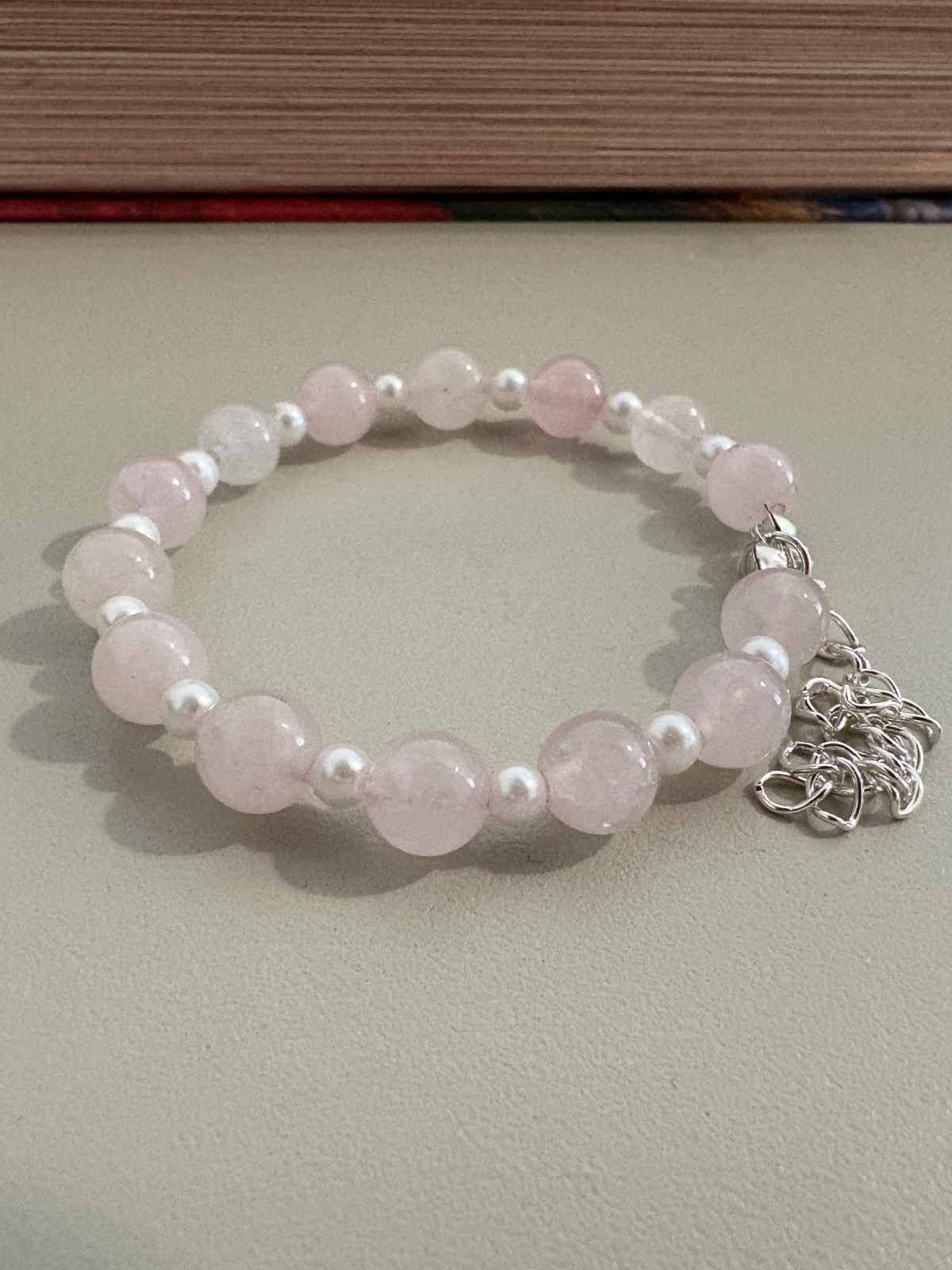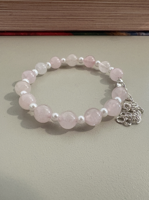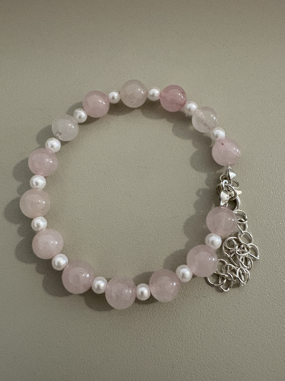Cuartul roz este cunoscut ca piatra iubirii, asociat cu deschiderea inimii, liniștea interioară și armonia emoțională, iar perlele completează designul cu o notă clasică și elegantă.