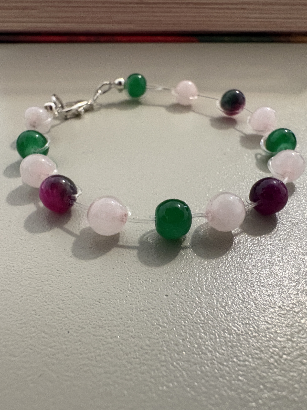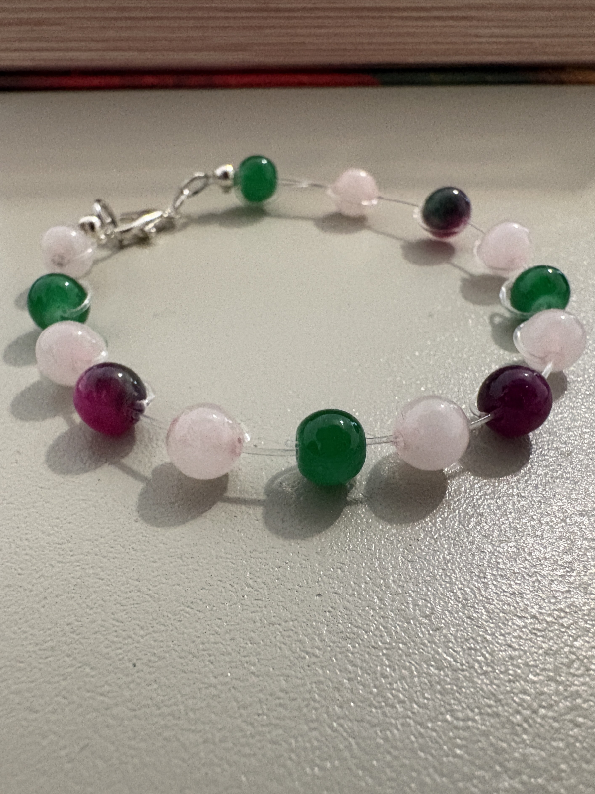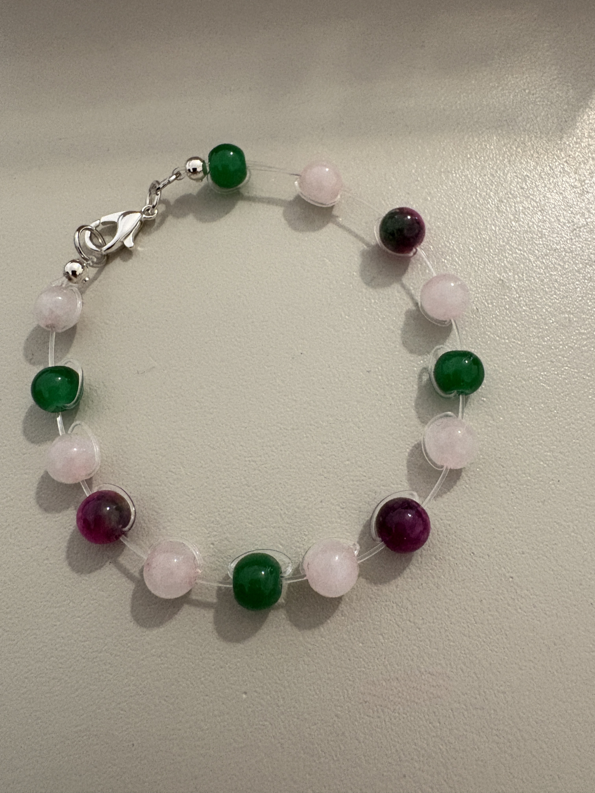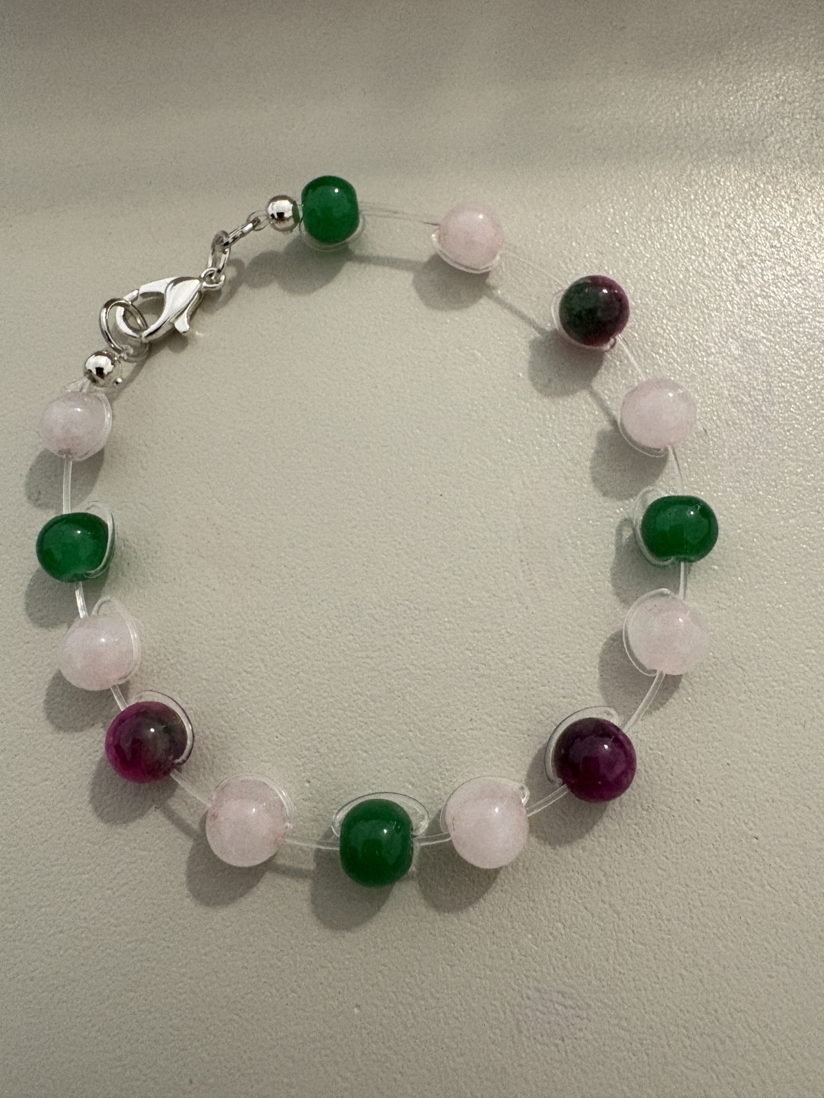 Brățară handmade plutitoare, realizată din cuarț roz, jad verde și rubin, montate pe fir transparent pentru un efect delicat și modern, în care pietrele par că plutesc pe încheietură.