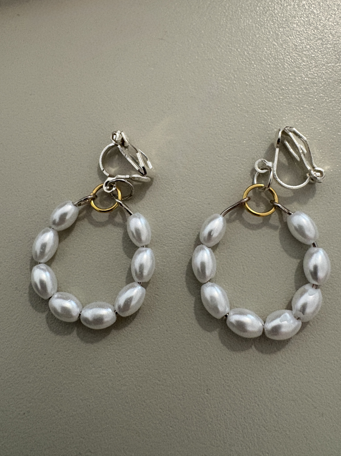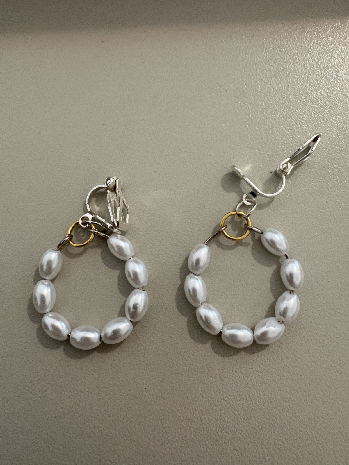 Descoperă cerceii "Cercei Magici" realizați din perle de sticlă în formă de lacrimă (bob de orez), montați pe sistem clips pentru confort și eleganță fără a fi nevoie de urechi perforate.