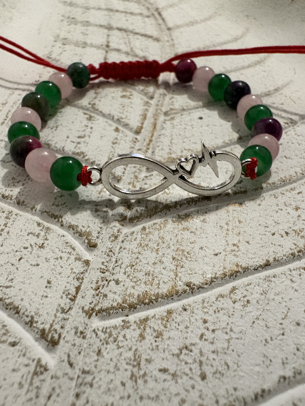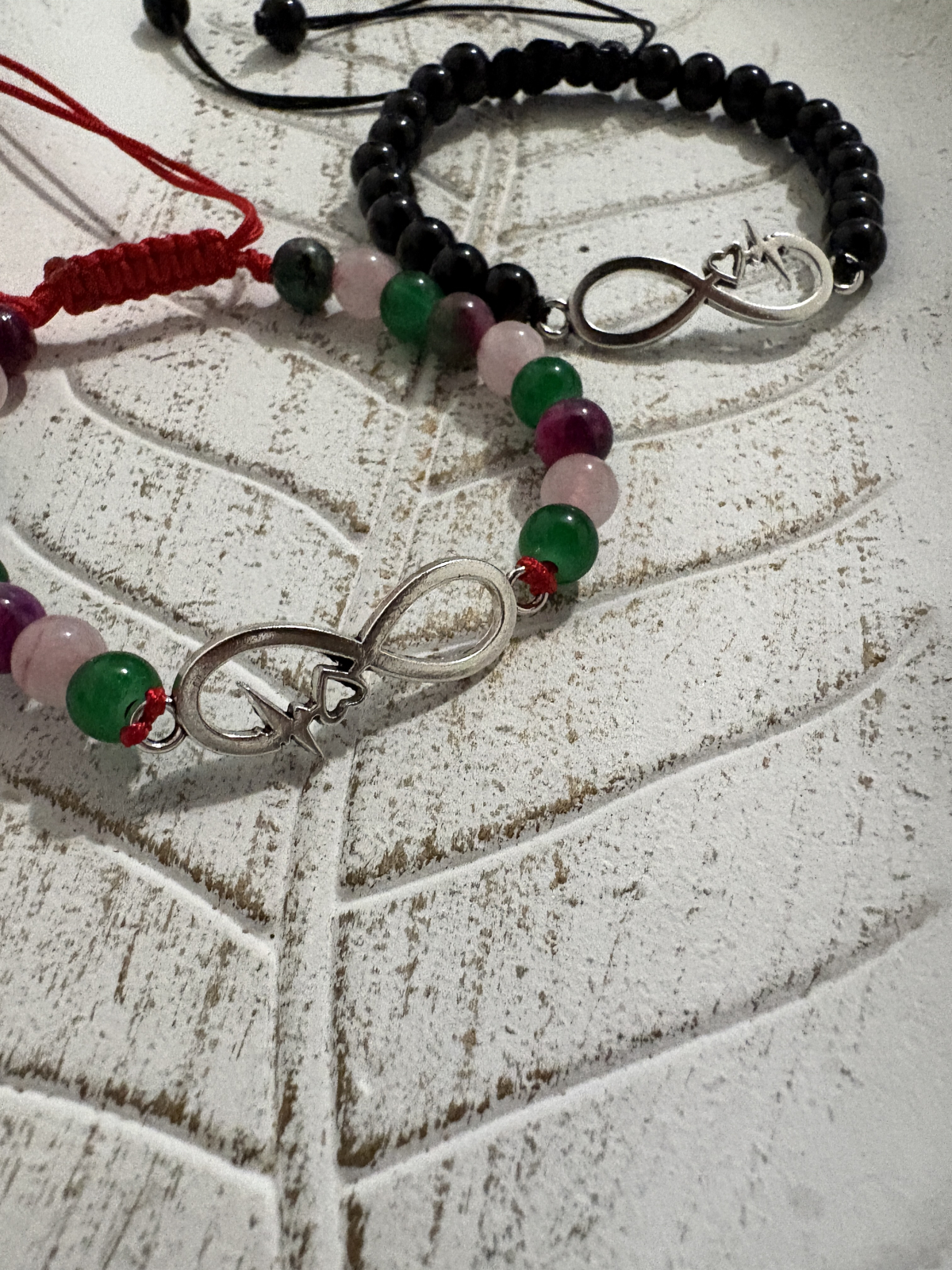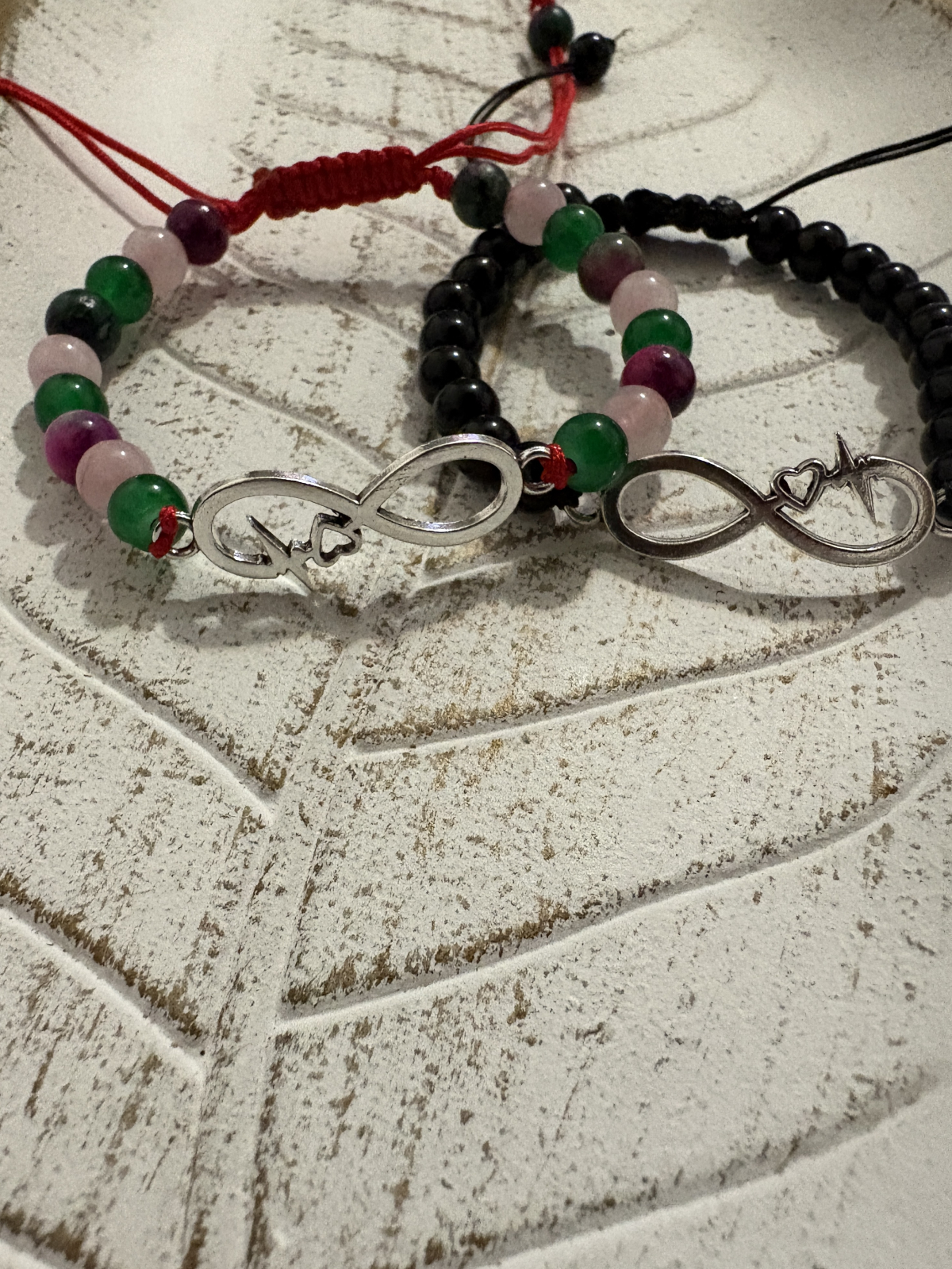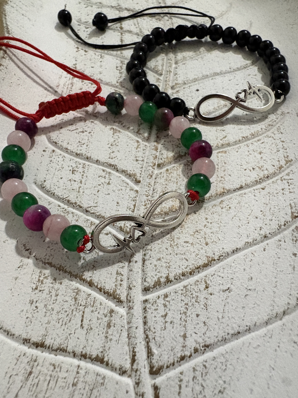 Set brățări handmade pentru cuplu, realizat din onix pentru EL și cuart roz, jad verde și rubin pentru EA, cu simbol infinit iubire și șnur reglabil. Brățările sunt create ca simbol al legăturii, armoniei și echilibrului dintre masculin și feminin.