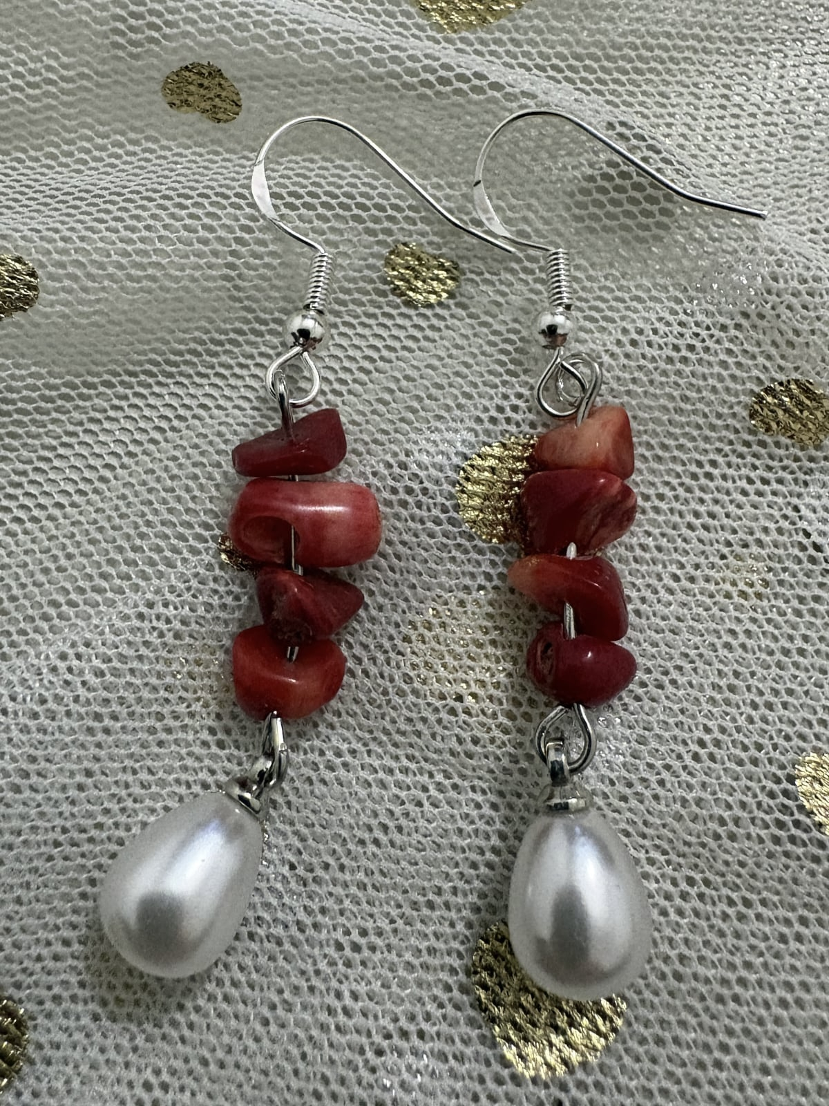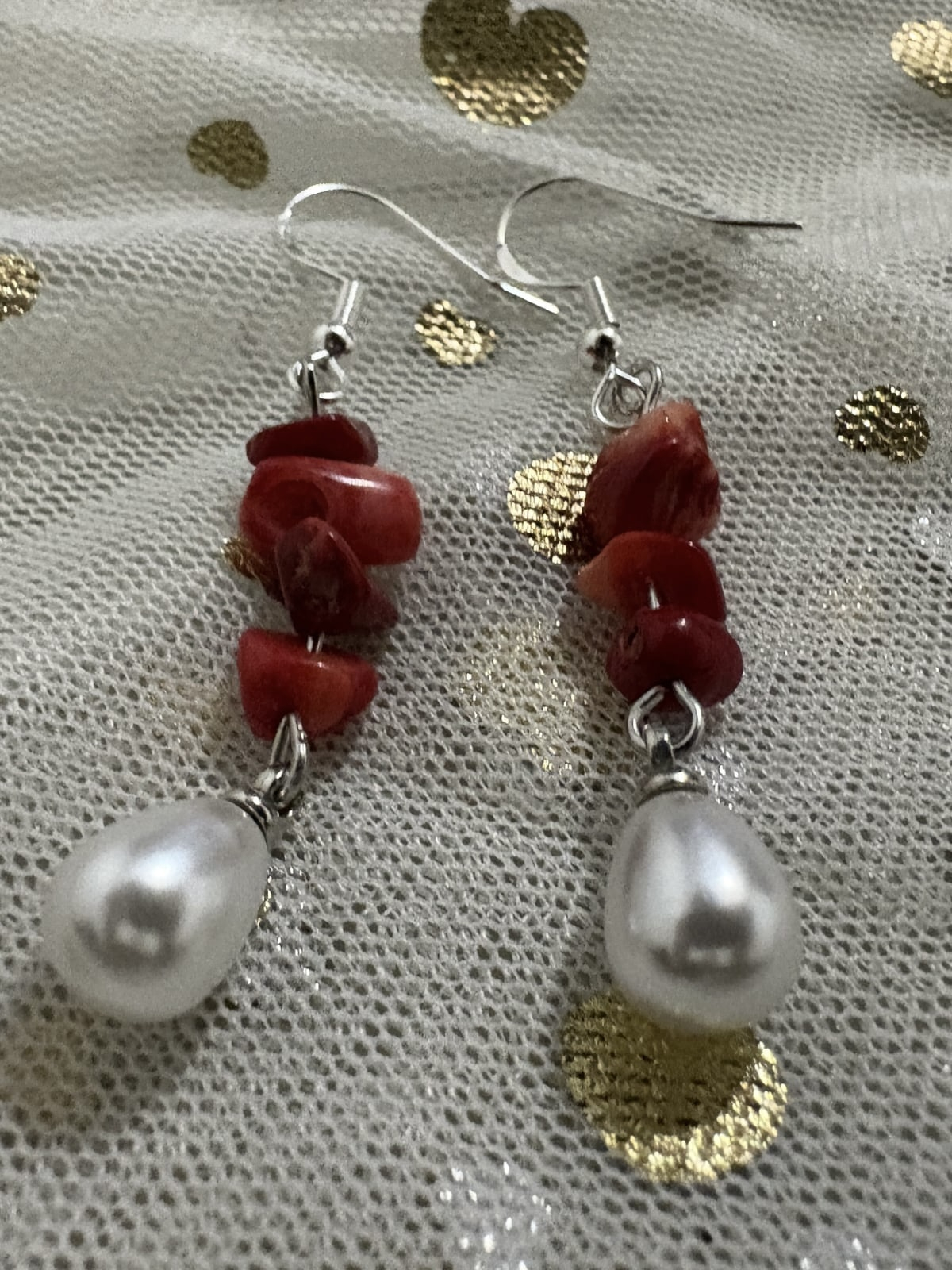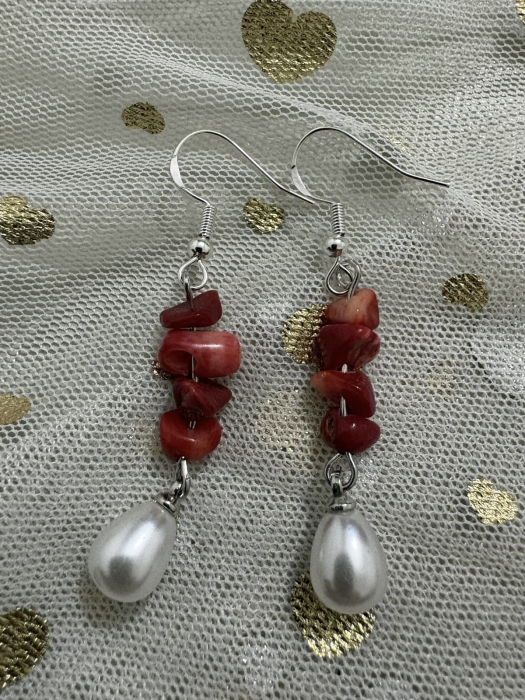 Cercei handmade din coral roșu natural și perle albe, cu formă alungită, eleganți și feminini, potriviți atât pentru mărțișor cât și pentru purtare zilnică.