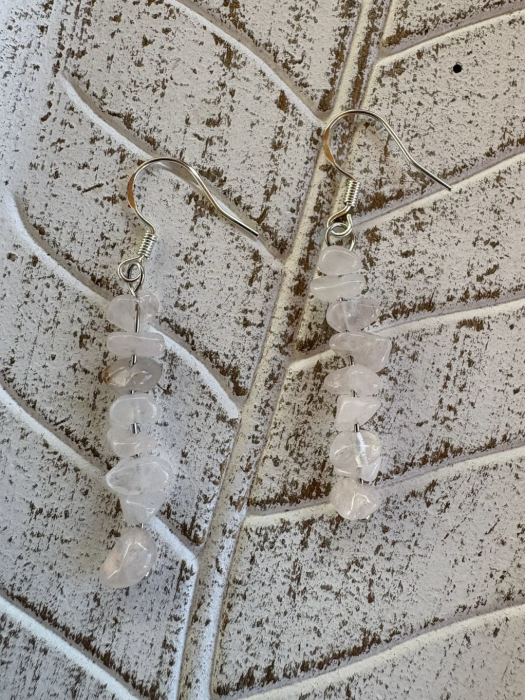 Cuart – cercei lungi cu bucăți neregulate de cuart roz, transparență delicată, look natural și minimalist.
