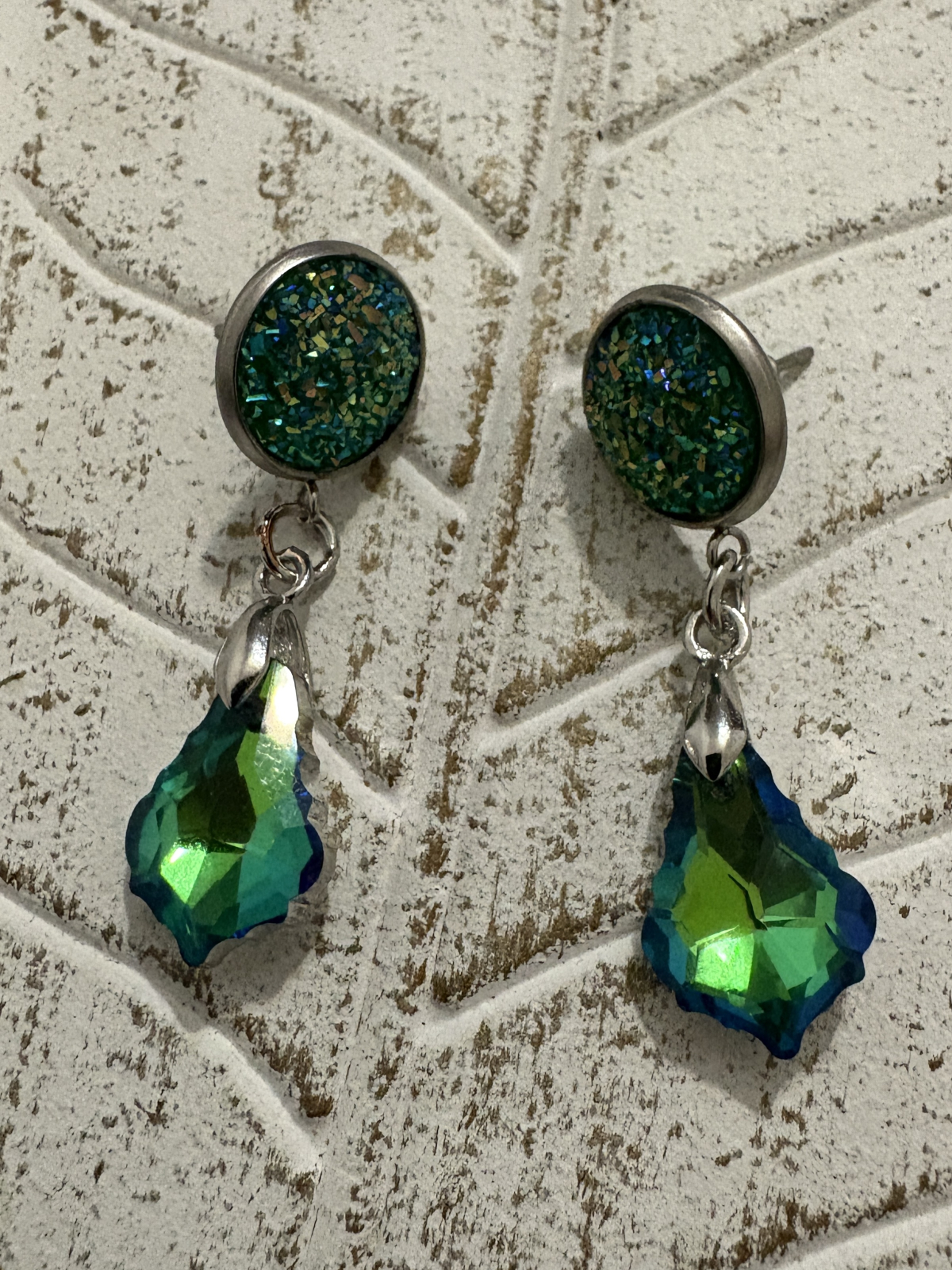 Cercei handmade cu cristal fațetat și cabochon verde, creați pentru strălucire, echilibru și expresivitate.